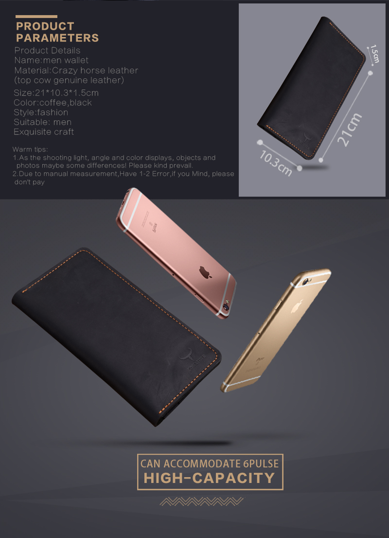 Name:men wallet Material:Crazy horse leather(top cow genuine leather) Size:21*10.3*1.5cm Color:coffee,black Style:fashion Suitable: men Exquisite craft Warm tips: 1.As the shooting light, angle and color displays, objects and