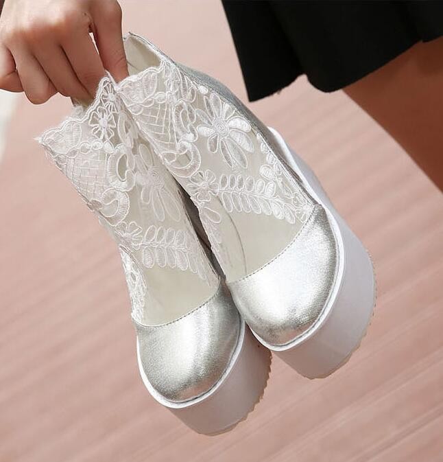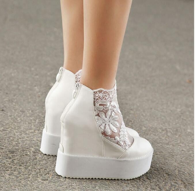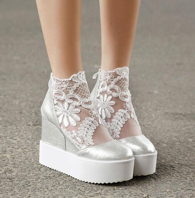 Fashion Sweet Lace Roman Shoes Women Wedge Heels White Platform Pumps High Heels Sandals Zapatos Plataforma Mujer Encaje 34-39