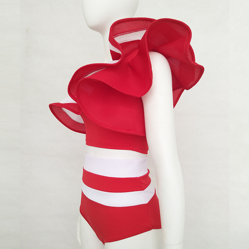 JYConline One Shoulder Bodysuit Red Black Striped Bodysuit Women Jumpsuit Ruffle Summer Short Romper Beach Crop Body Top Overall
