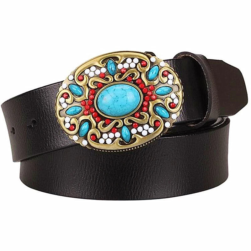 women’s Genuine leather belt mosaic gem turquoise belts metal buckle arabesque pattern retro woman decorative belt gift